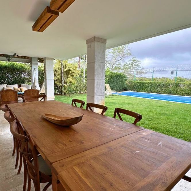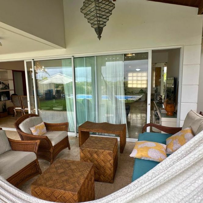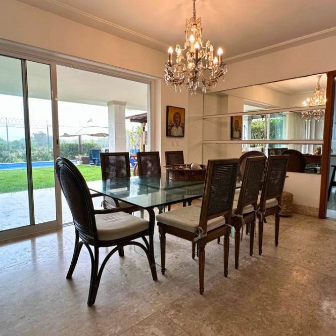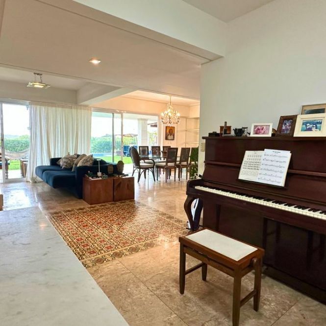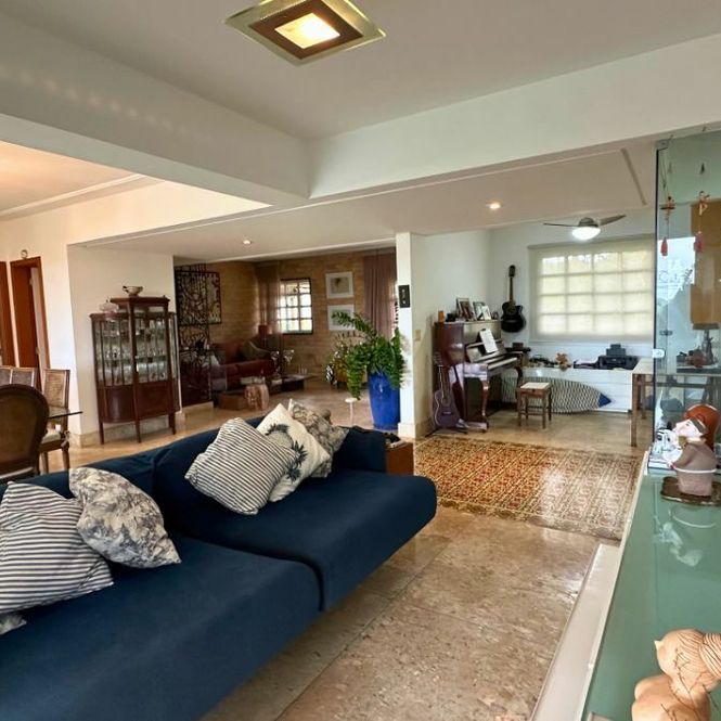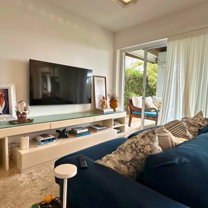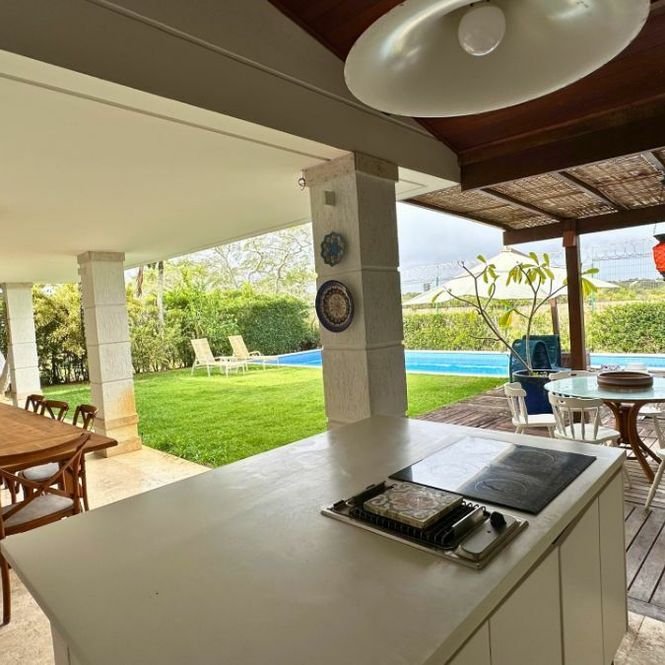 A sala generosa se abre para a área gourmet e piscina, criando uma atmosfera que convida a viver bem todos os dias — seja para receber ou simplesmente aproveitar a casa com calma.